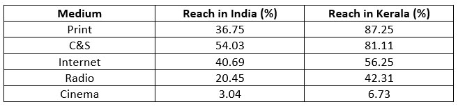 Print continues to play a pivotal role in Kerala in the dissemination of information. Along with being the most credible medium, print has the highest reach among all mediums in Kerala. From a media planning perspective, Kerala needs to be looked at differently as a strong print market. In fact while print forms 16% of the national adex, in Kerala – print’s share of the advertising pie is more than 50%.
