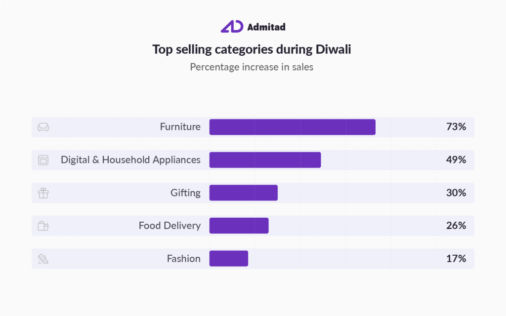 Admitad’s observations show that consumers have invested significantly in Digital and household equipment like Mobile Devices, Televisions, Home Audio Systems, Large Appliances, etc., which witnessed the biggest hike in sales during the festival time. The sale amount under this category almost doubled,  recording over INR 90 Million as compared to a little over INR 50 Million during the week before Diwali.