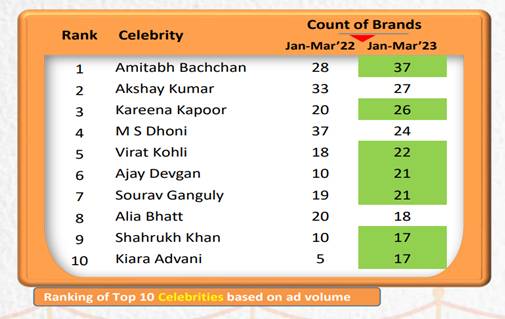 In Jan-Mar’23, seven of the top 10 celebrities, including ‘Amitabh Bachchan’, ‘Kareena Kapoor’, ‘Virat Kohli’, ‘Ajay Devgn’, ‘Sourav Ganguly’, ‘Shahrukh Khan’, and ‘Kiara Advani’ endorsed more brands than in Jan-Mar’22. Three out of Top 10 celebrities were from Sports profession.