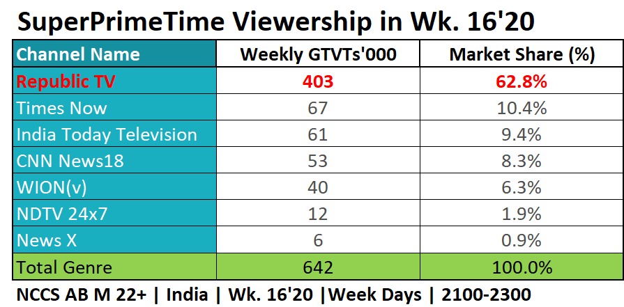 Republic TV in week 16 has garnered a total of 403 GTVTs in ‘000 which translates into a market share of 67% in the Super Prime Time slot from 9:00 PM to 11:00 PM on weekdays. Competition channels in the English News genre are nowhere close to Republic TV in the given time slot. (Source, BARC: NCCS AB M 22+ | India | Week Days)