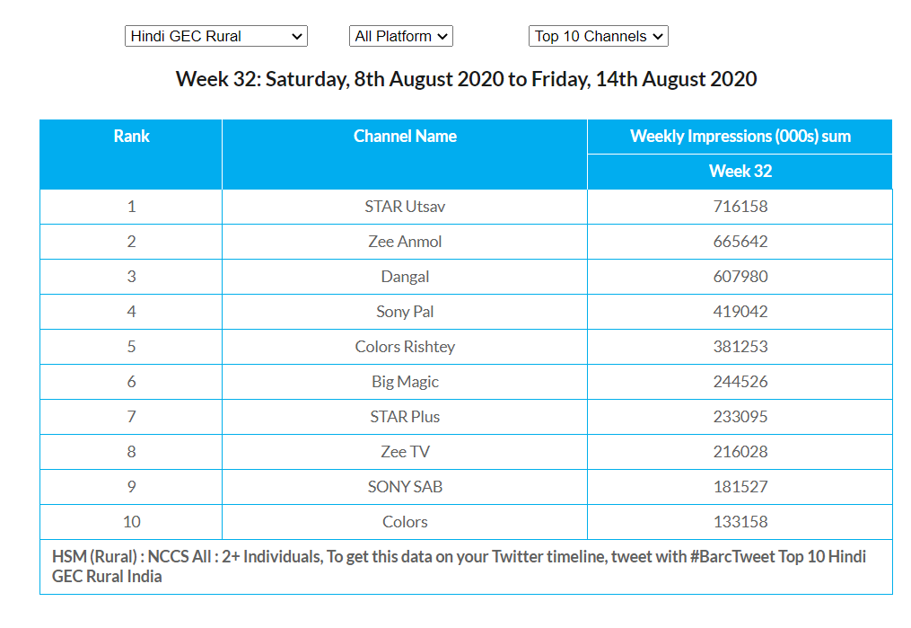 This week we see Star Utsav leading the Hindi GEC Rural category followed by previous week’s leader Zee Anmol on the 2nd spot. Dangal still is at the 3rd spot and Sony Pal moves up and secures the 4th spot this week. ColorsRishtey and Big Magic are standing strong at the 5th and 6thspot. While we see Star Plus, ZEE TV, Sony SAB and Colors being the last 4 contenders in this category.