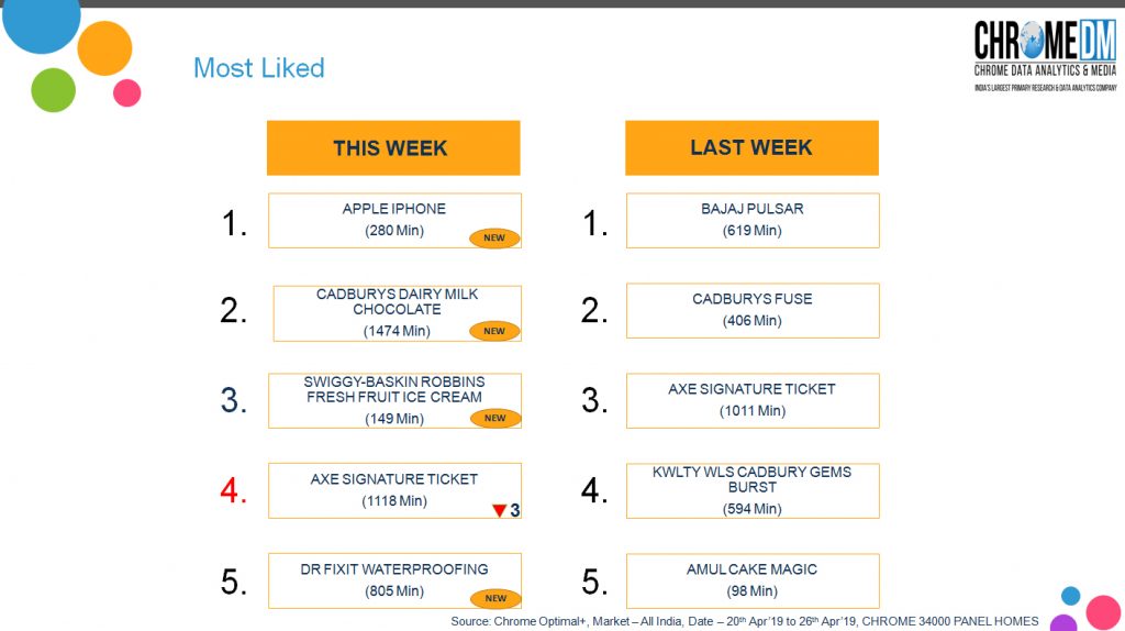 Apple iPhone also happened to be the Most Liked Brand in Week 17, followed by Cadbury Diary Milk Chocolate in 2nd position. Online food delivery brand Swiggy manages to secure 3rd place by pulling down Axe Signature Ticket to 4th position. Dr Fixit captures 5th place while brands like Bajaj, Cadbury, Kwality WLS and Amul is seen exited from Most liked Ads category in this week.