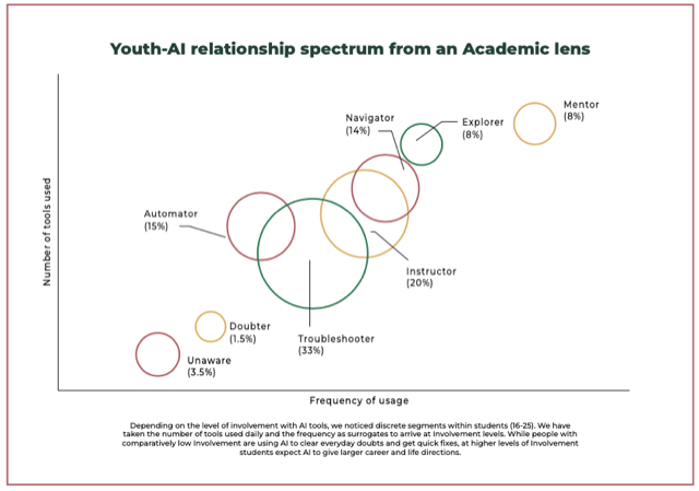 6. Mentor: 6% use AI as a co-builder of new ideas or ventures, they are mostly STEM (31%) and Business (24%) students. This segment is not just using AI; they are also creating future applications and businesses around AI.