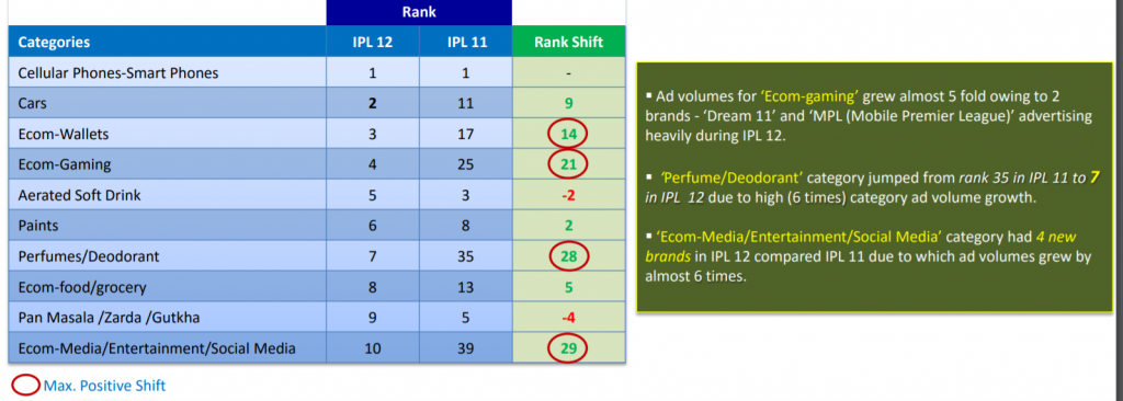 Top 10 categories together contributed to 54% share of advertising during IPL Season 12, among Top 10 categories, Cellular Phones – Smart Phones topped with 13% share of ad volumes.4 out of top 10 categories were from E-commerce sector and together contributed 18% share of commercial advertising during IPL Season 12.
