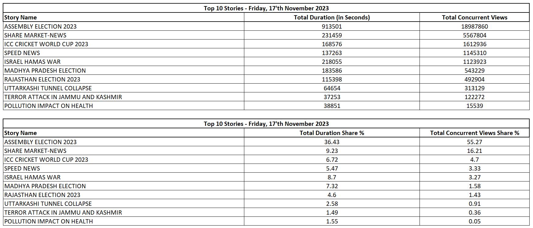 The total Story Duration or the Total Concurrent Views will not add up to 100% because the table above includes only the top 10 stories and not the entire universe of stories.