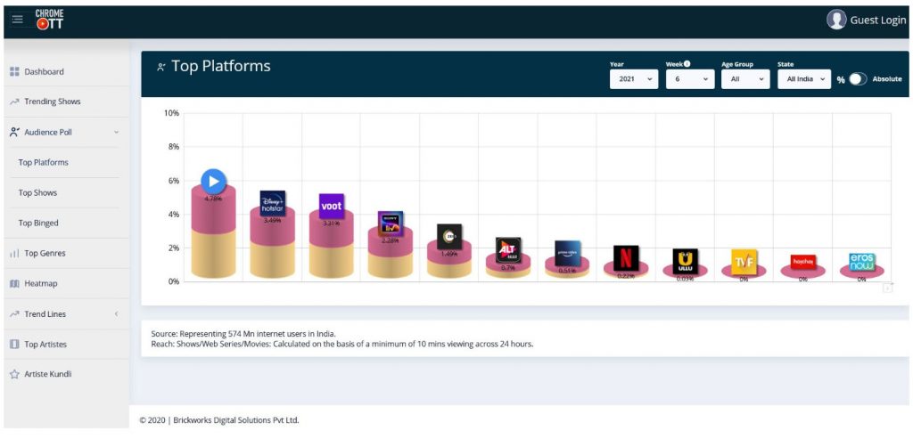 In the 6th week of COTT MX Player was the top platform with 27.43 Million unique viewers translating to a reach of 4.78%. In the last week, the Mx player was in the 3rd position with only 2,35% and now it has jumped up to 1st place. The 2nd place is taken by Disney+ Hotstar with 3.49% whereas the 3rd place is taken by Voot with 3.31% followed by Sony Liv with 2.38% and Zee5 with 1.49%.