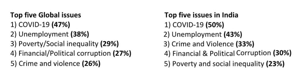 Financial/ Political Corruption (27%) is the fourth major concern, but in relative terms, India ranks 11th place globally on this measure.