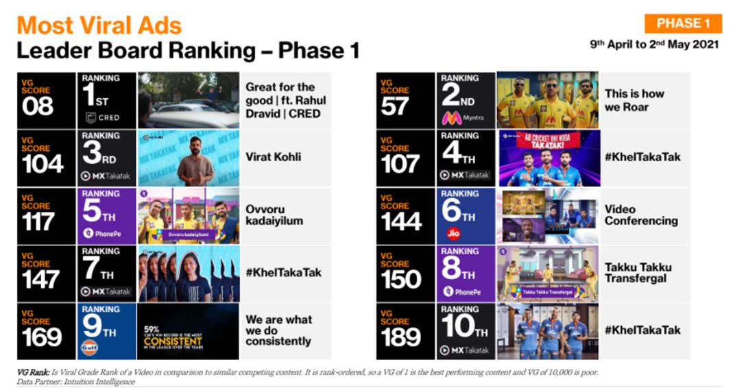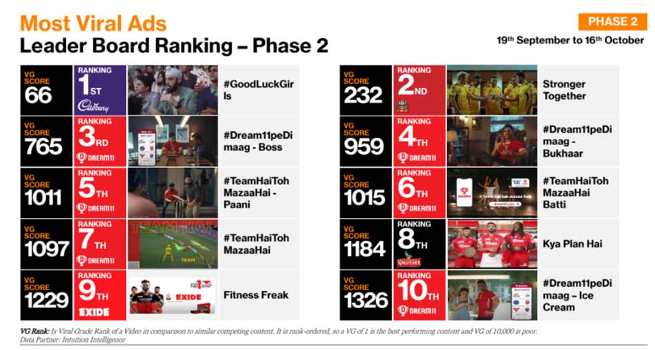In the first phase of IPL, CRED’s ‘Great for the Good ad’ with Rahul Dravid claimed the top spot. Myntra’s ‘This is how we roar’ took the second spot and MX TakaTak’s ad with Virat Kohli was on the third spot in phase 1. In phase 2, the viral ad from Cadbury #GoodLuckGirls took the first spot followed by CSK’s Stronger Together. #Dream11peDimaag- Boss claimed the third spot.  Amongst the top 10 viral ads on IPL in phase 2, 5 ads were by Dream 11.