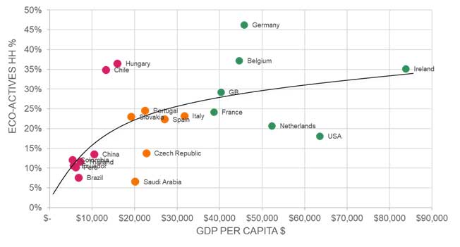 Germany has the largest Eco-actives segment – accounting for 46% of households in 2021, followed by Belgium and Hungary. At just 7% of households, Saudi Arabia is the country with the lowest penetration of eco-actives. There is a direct correlation between GDP per household and the prevalence of eco-active households (see chart 1). Of the more economically advanced countries, the Netherlands and the United States have the lowest incidence of Eco-actives.