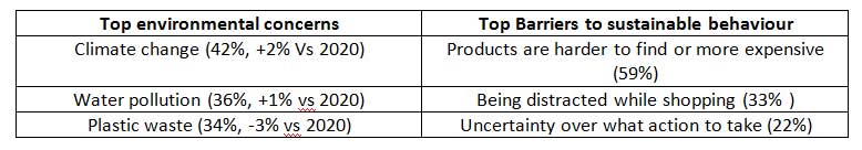 Kantar also asked consumers to identify their major sustainability concerns and their major barriers to acting sustainably. Table 1 shows the top concerns and barriers.
