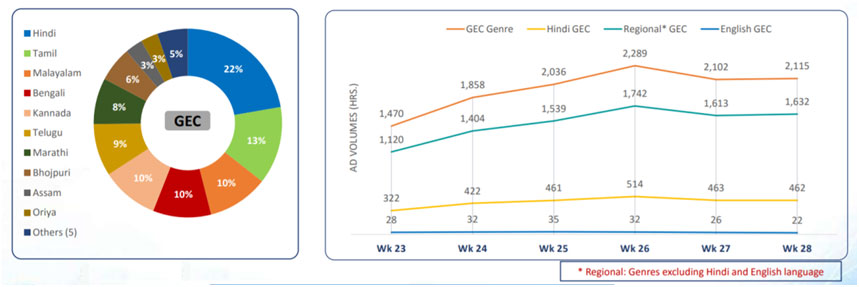 Among GEC genres, Hindi GEC topped with 22% share of Ad Volumes followed by Tamil GEC. Malayalam, Bengali and Kannada had almost equal share of Ad Volumes and weekly Ad Volumes for Hindi, Regional* and English GEC saw a similar trend.