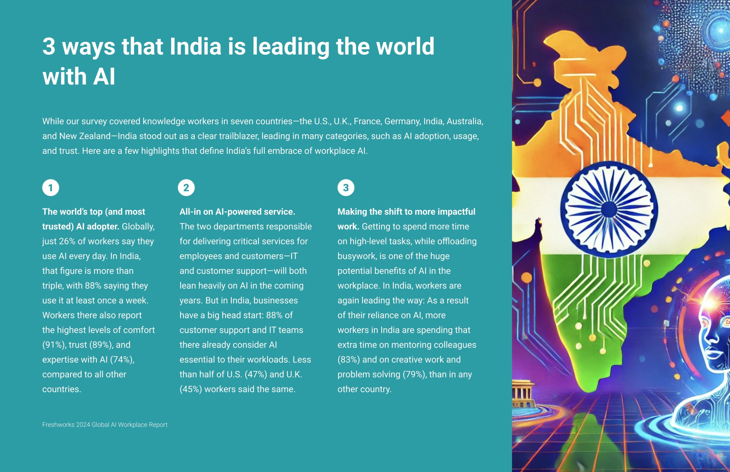 The Freshworks AI Workplace Report positions India as a global leader in AI adoption, trust, and investment. With strong workforce upskilling initiatives, increased budgets, and measurable ROI, India is setting benchmarks for how businesses can leverage AI to drive innovation, empower employees, and fuel sustainable growth.