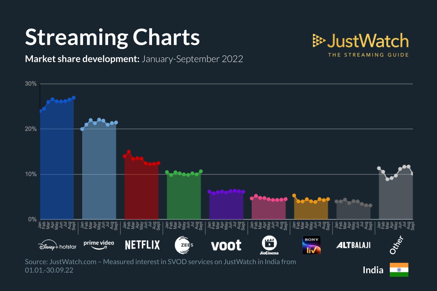 JustWatch, a streaming guide for OTT market share has released the data for Q3 2022. According to its third quarter data for the Indian OTT (SVOD) markets, Disney+ Hotstar leads with 27 pc share followed by Prime Video with 21 pc share.