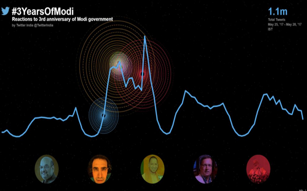 Delhi : Twitter is the best place to know what’s happening around the world and to talk about it. There were over 1.1 million conversations on Twitter between 25th – 28th May, discussing the 3rd anniversary of Modi government. From politicians, athletes, entertainers to Indians from all walks of life, people flocked to Twitter to wish the PM and his Government on their successful three years with hashtags such as #3yearsofmodigovt and #modi3years. Prime Minister Modi reciprocated with his own message on the platform too.