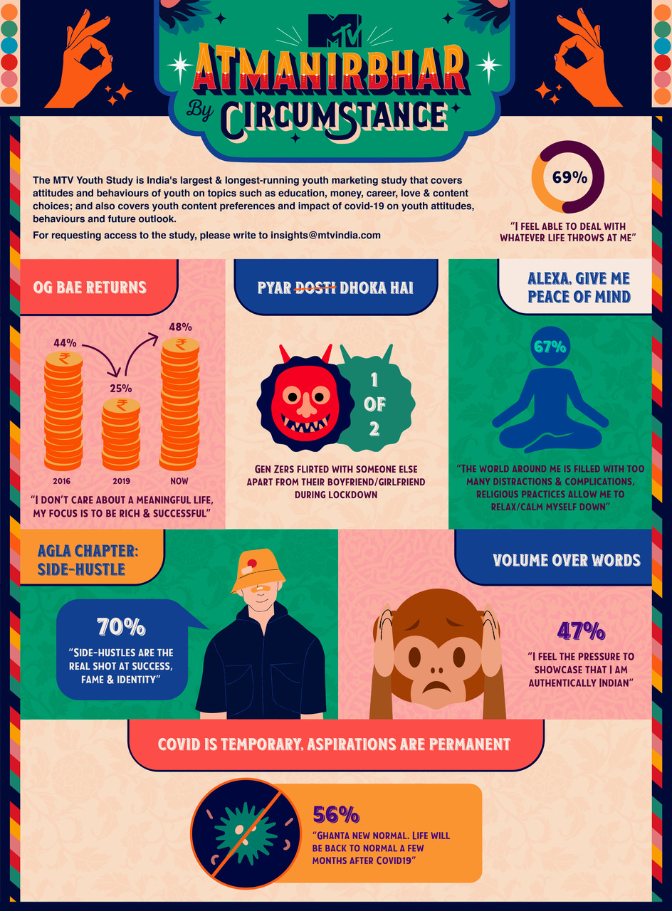Amid a raging pandemic, Atmanirbhar by Circumstance examines Gen Z’s evolving thought processes and choices. With over 26,000 respondents aged 15 to 25 years from 50 Indian cities across NCCS A, B, and C, Atmanirbhar by Circumstance is the result of 185 questions covering seven broad topics: Education, Money, Romance, National Interests, Content, Family, Friends, and Spirituality, and COVID-19 Outlook.