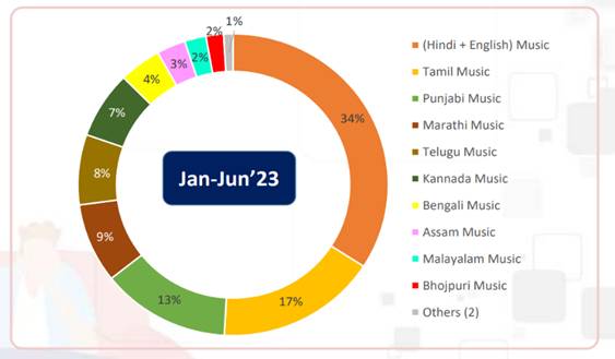 ‘Food & Beverages’ led the Top 10 list of Leading Sectors with 26pc share of ad volumes. Food & Beverages, Personal Care/Personal Hygiene and Household Products retained their first, second and third positions respectively during Jan-Jun’23 compared to Jan-Jun’22. ‘Auto’ was the only new entrant. The top 10 sectors together contributed 95pc share of ad volumes in Music Genre.