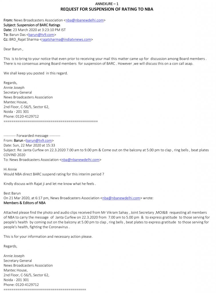 Incidentally, it is pertinent to point out here that TV9 Network, home to four leading regional news channels apart from TV9 Bharatvarsh — the No.2 Hindi News Channel — was more concerned about the lives of journalists than ratings during the pandemic. That is why on March 22, two days before the Lockdown, we proposed to the NBA that the ratings regime should be suspended for a few weeks so that the industry did not compromise the lives of reporters and camerapersons in the quest for ratings. (Annexure 1)