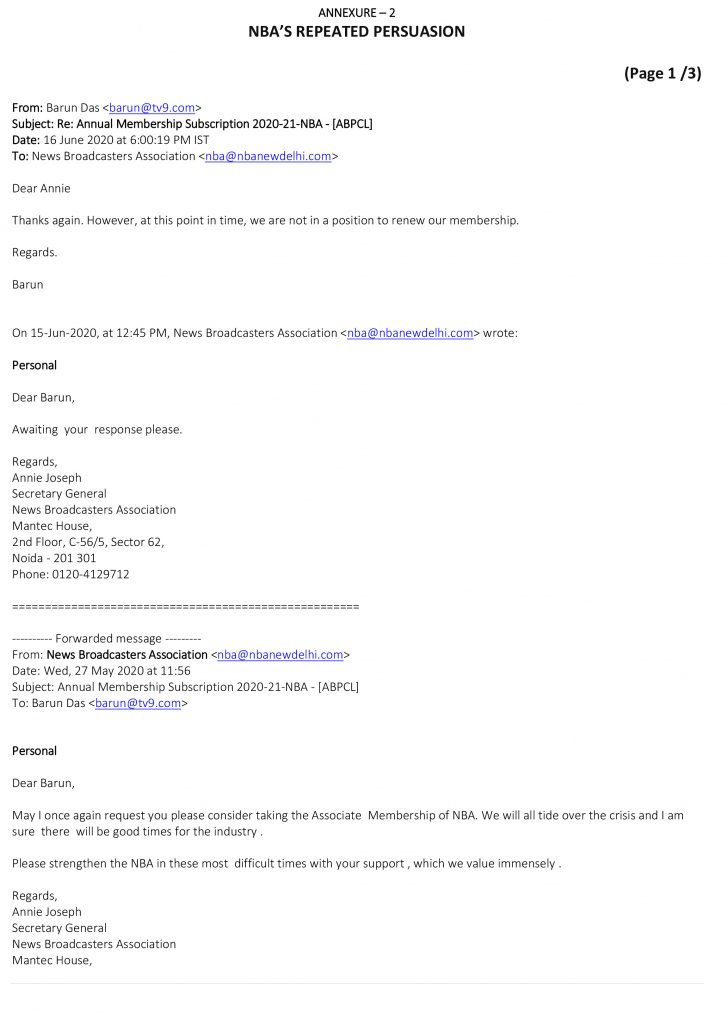 Till very recently, the NBA was relentlessly courting TV9 Network to retain its membership after the Network decided not to renew the same on March 31’ 2020. On June 16, after due consideration, we politely refused (Annexure 2). One month later, we are in the NBA’s bad books. Is this coincidence or coercion?