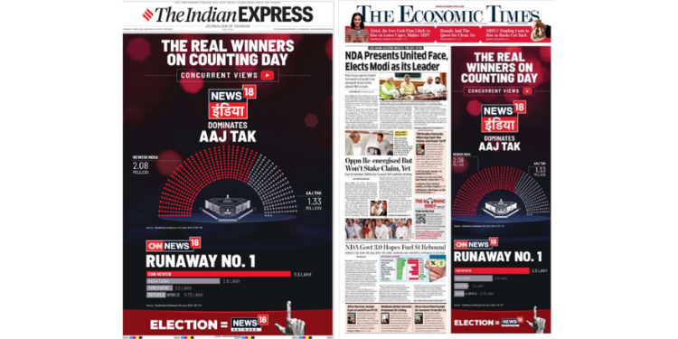 The news network released a front-page ad in all editions of The Economic Times and The Indian Express to showcase the highest concurrent viewsof News18 India and CNN-News18 on the crucial hour of Counting Day. The campaign is set to go live on digital and social media, with extensive visibility on trade media as well.