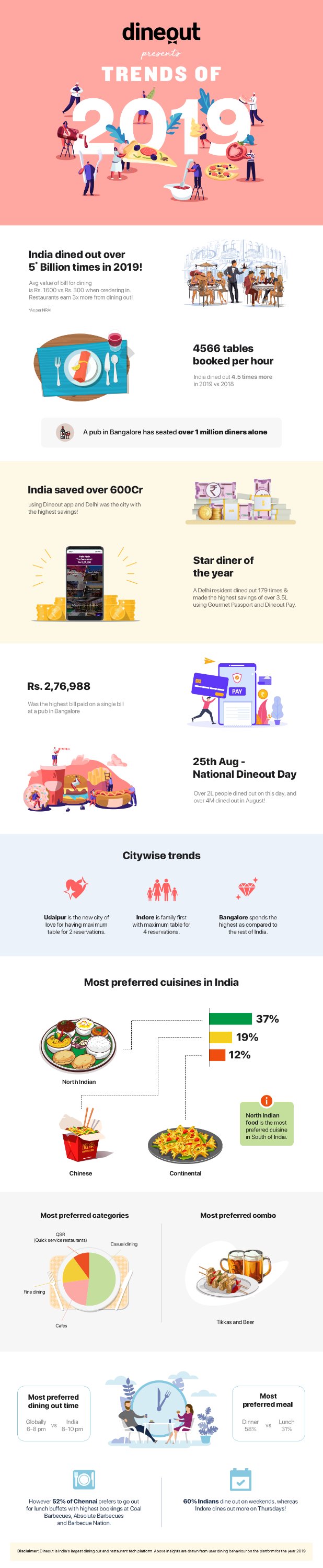 New Delhi: As per the recent report published by India’s most sought after restaurant solutions company – Dineout, Indians dined out 4.5 times in year 2019 as compared to 2018 through Dineout platform with almost 60% of them dining over the weekends.