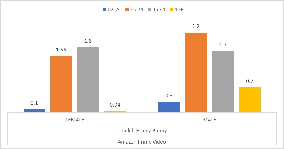 Content and Device Trends: The data showcases a shift in viewing habits, with a significant share of audiences engaging through Connected TVs, indicating a preference for large-screen experiences. However, mobile devices continue to dominate, especially for content with widespread linguistic appeal, as seen with ‘Citadel: Honey Bunny’.