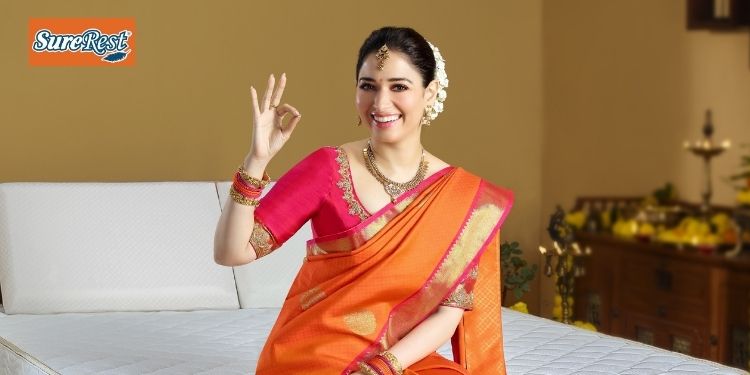 The TVC featuring Tamannah is seen in a home that has a wedding, sitting on a new mattress encouraging all newlyweds to have a good beginning with SureRest Mattress. The video ends with a message that people can get free bed sheets, pillows, and pillow covers with SureRest Mattress this wedding season. The mattress brand is also offering discounts of up to 15pc.