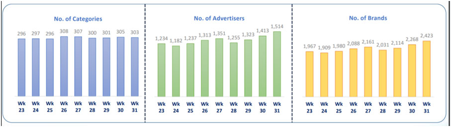 A stable trend in tally of categories, advertisers and brands observed during last 9 weeks. 15% rise in avg. number of advertisers and brands during week 30-31 compared to week 23-29, week 31 registered maximum number of advertisers and brands.