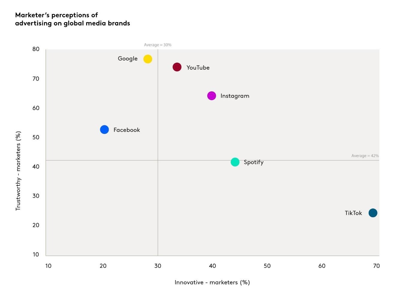 TikTok is not yet trusted by marketers as much as the more established platforms, but it has made enormous improvements in the past year. It remains comfortably the most innovative place for ads, and trust has doubled, so many more marketers are now positive about placing ads on the platform.