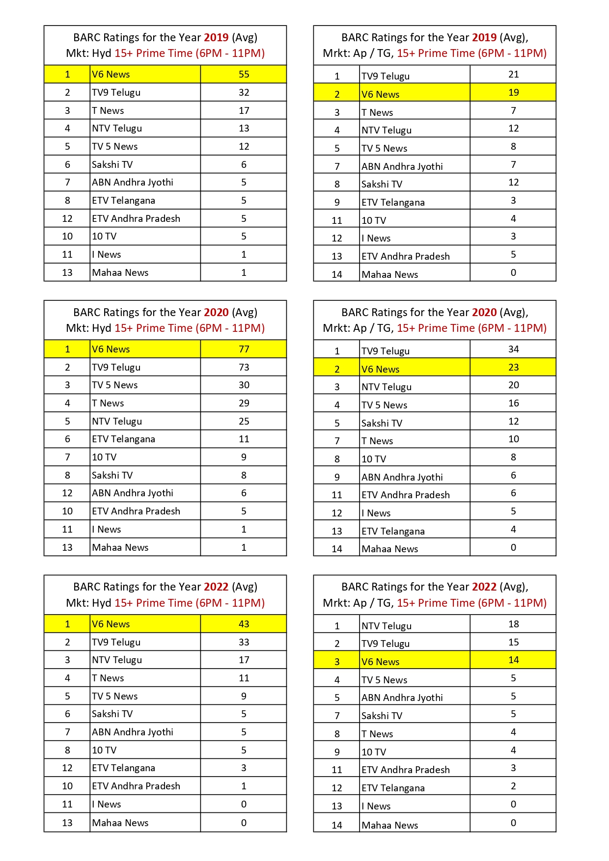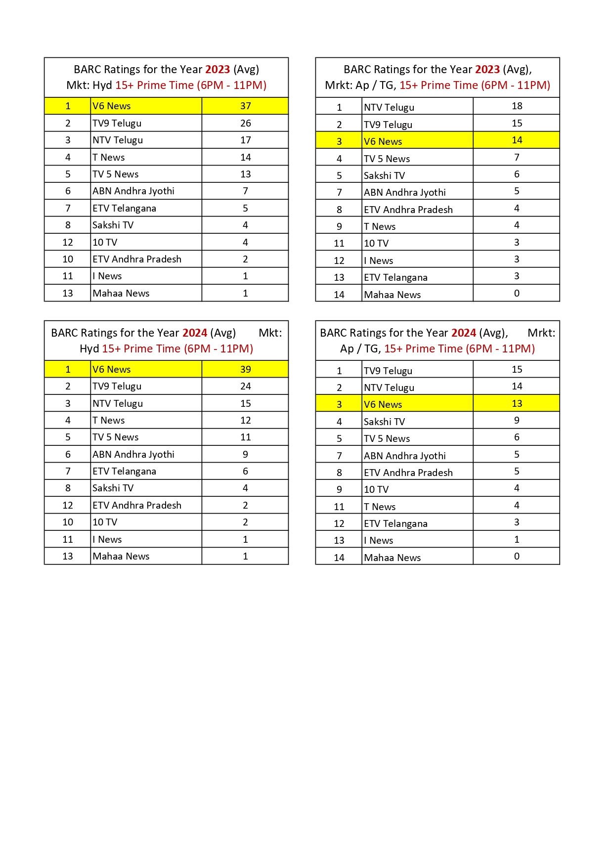 With its commanding viewership in prime time and its growing digital presence, V6 News offers unparalleled value for media agencies and advertisers. Its dual focus on traditional and digital platforms ensures maximum reach and engagement, making it a premier choice for brands looking to connect with Telugu-speaking audiences.