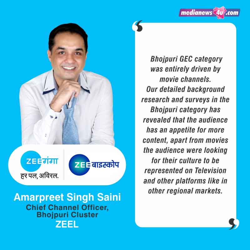 “Bhojpuri GEC category was entirely driven by movie channels. Our detailed background research and surveys in the Bhojpuri category has revealed that the audience has an appetite for more content, apart from movies the audience were looking for their culture to be represented on Television and other platforms like in other regional markets,” said Amarpreet Singh Saini, Chief Channel Officer, Bhojpuri Cluster, ZEEL while talking about the factors that led to formulating content strategies for Zee Ganga & Zee Biskope.