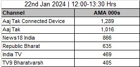Coinciding with the findings of the report the Live TV feed of Aaj Tak’s CTV has registered significant views with peaking concurrency and time spend when compared with TV viewership of leading News Broadcasting Networks. For instance, the chart reveals that Aaj Tak’s CTV was leading with 1289 (AMA 000’s) vs Aaj Tak TV clocking 1016 (AMA 000’s) on 22nd January 2024, which shows clear leadership of digital against Television feeds.