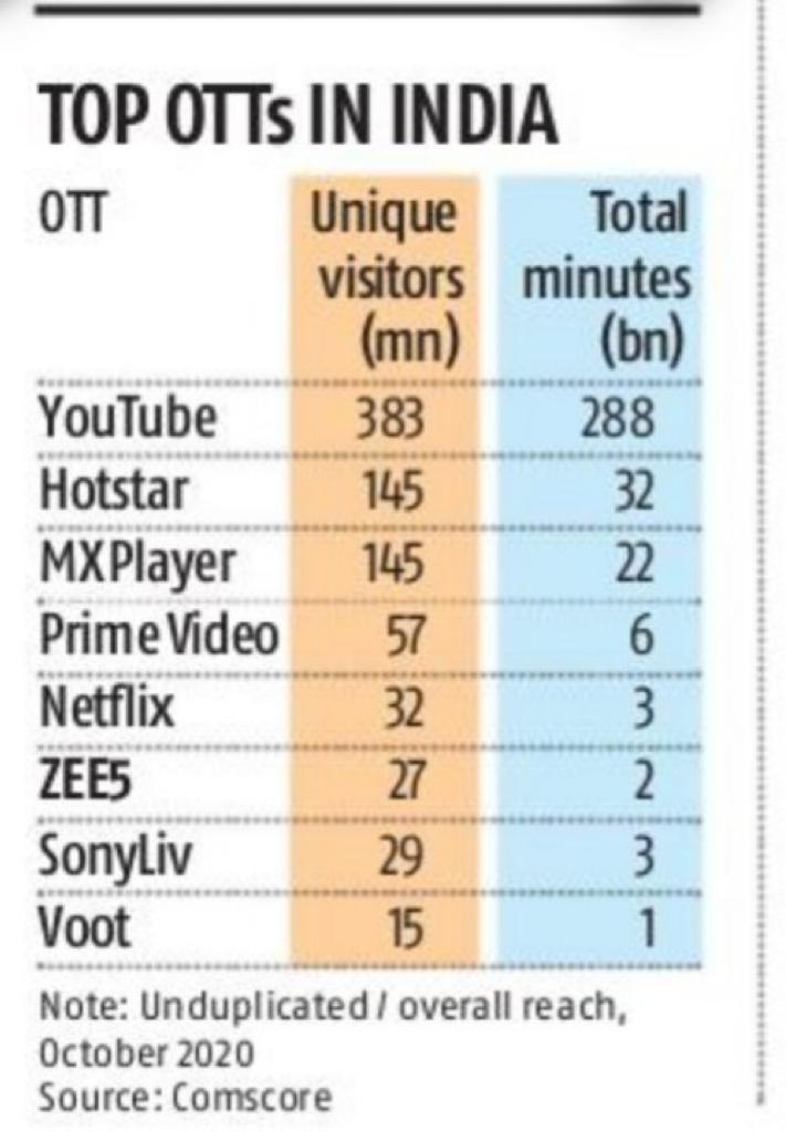 According to the report YouTube is the Top most OTT platform in India. It has 383 mn unique visitor this year and total 288 billion minutes spend on it. Youtubers like Prajakta Koli, Ashish chanchalani, Bhuvan bam, superwomen be you nick, some gaming youtubers like Dynamo, Alpha Clasher and many more has entertained the audience throughout the whole lockdown.